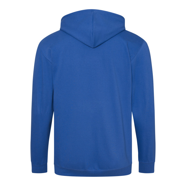 Durchgehender Reißverschluss. Innen gebürstet. Unsichtbarer Reißverschluss. Gefütterte Kapuze mit Zugbändern in passender Farbe. 2 Fronttaschen. Rippenbündchen an Ärmel und Saum. Ablösbares Etikett.