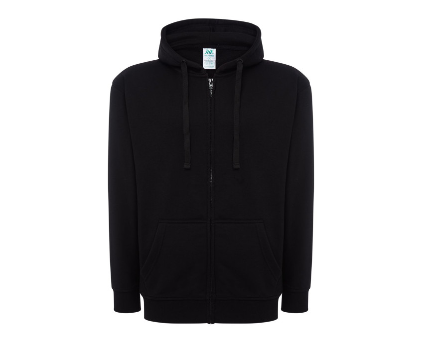 Unisex-Sweatshirt mit durchgehendem Reißverschluss und Kapuze. Zugband in gleicher Farbe. Kängurutasche. 1x1 Rippenbündchen aus Lycra an Ärmel und Bund.