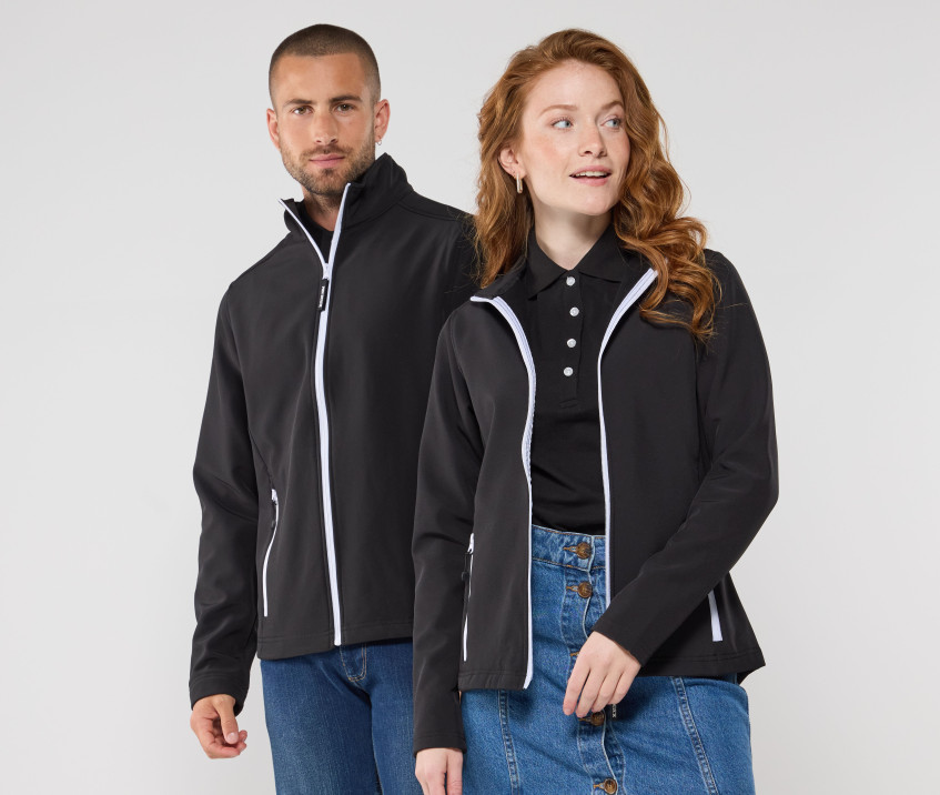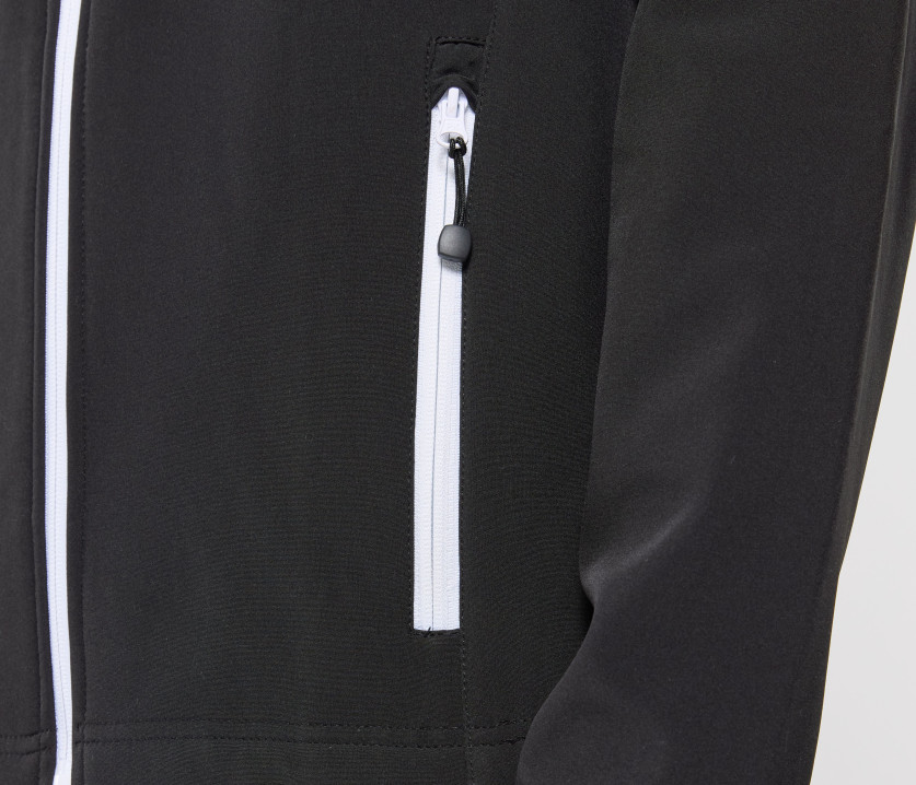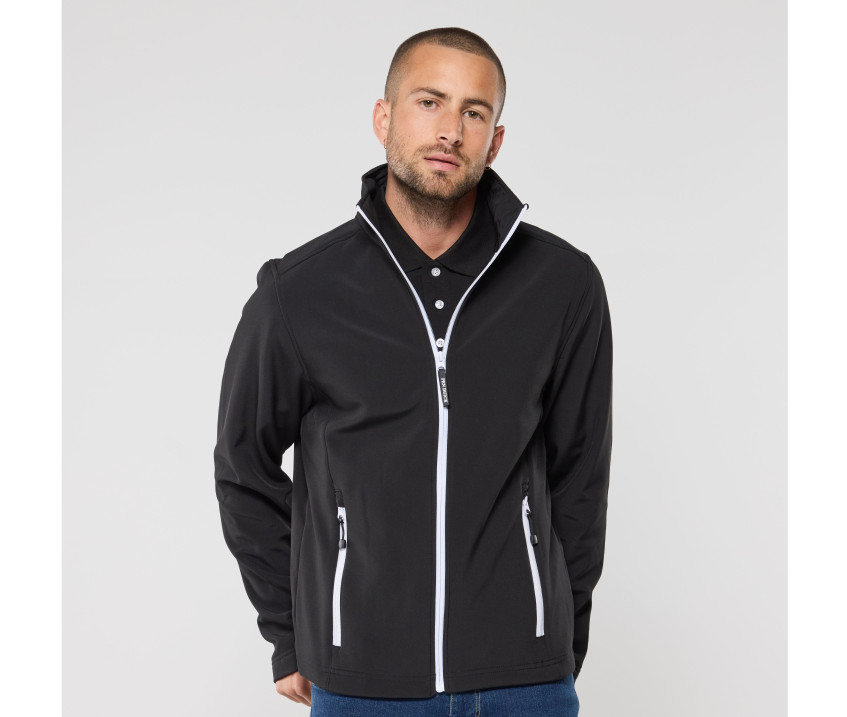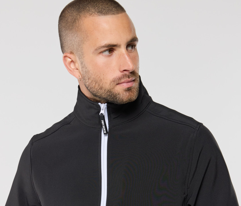 Softshell Herren. Fleece-Futter. Umgekehrter Reißverschluss. Eingesetzte Ärmel. 2 Innentaschen aus Netzgewebe. 2 Taschen mit Reißverschluss an den Seiten. Kinnschutz. Bodywarmer Ref. PK330 Seite 185.