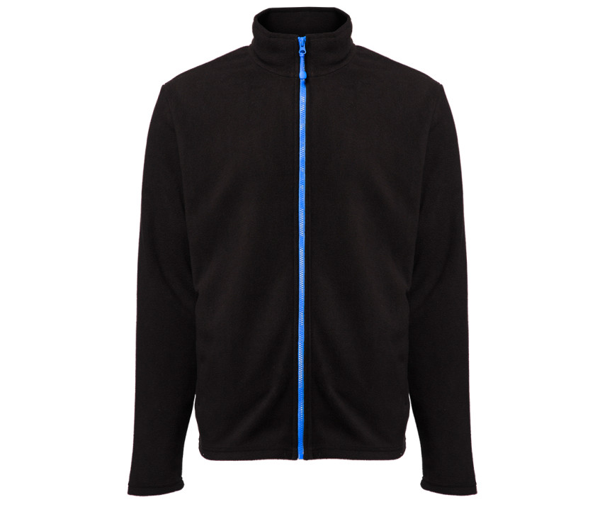 Modische Fleecejacke. 2 Reißverschlusstaschen an der Seite. Reißverschluss. Hauptreißverschluss und Reißverschlüsse der Taschen in Kontrastfarben.