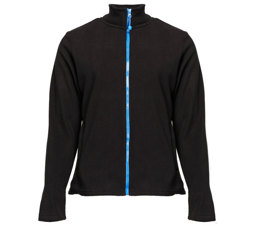 Modische Fleecejacke. 2 Seitentaschen mit Reißverschluessen. Reißverschluss. Hauptreißverschluss und Reißverschlüsse der Taschen in Kontrastfarben.
