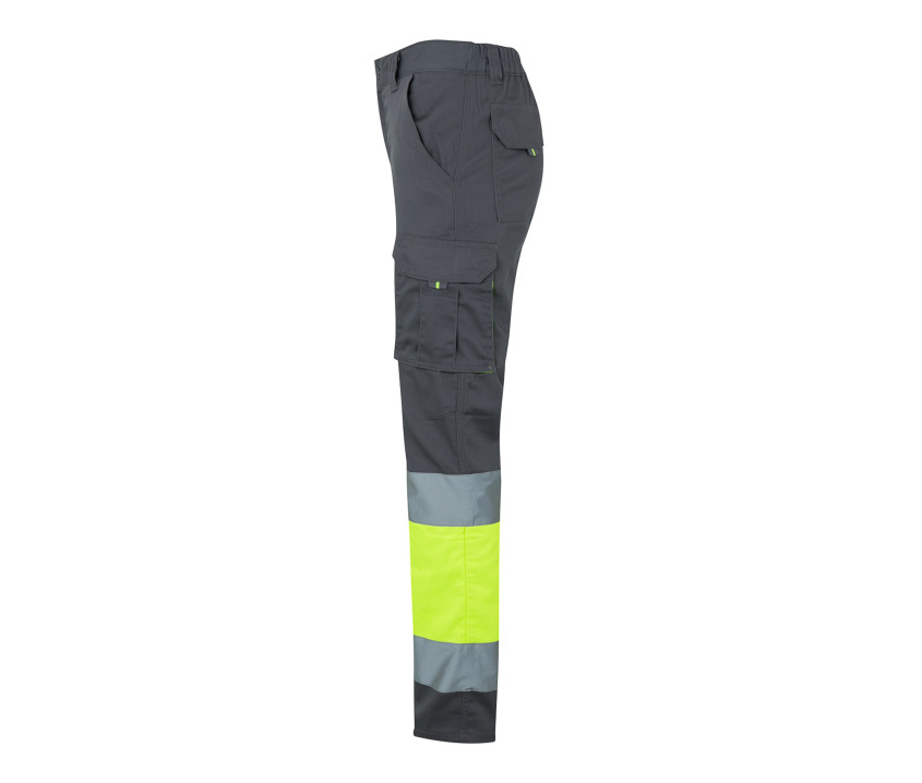 Mittiger Reißverschluss mit Knopf. Kontrastnähte. Elastischer Bund. Doppelte Sicherheitsnaht. 6 Taschen: 2 Seitentaschen. 2 Taschen mit doppeltem Klappenverschluss, Klettverschluss und Ziehern. 2 Taschen hinten, mit Klappen und Klettverschluss. Zertifiziert nach EN20471: 2013 Klasse 1.