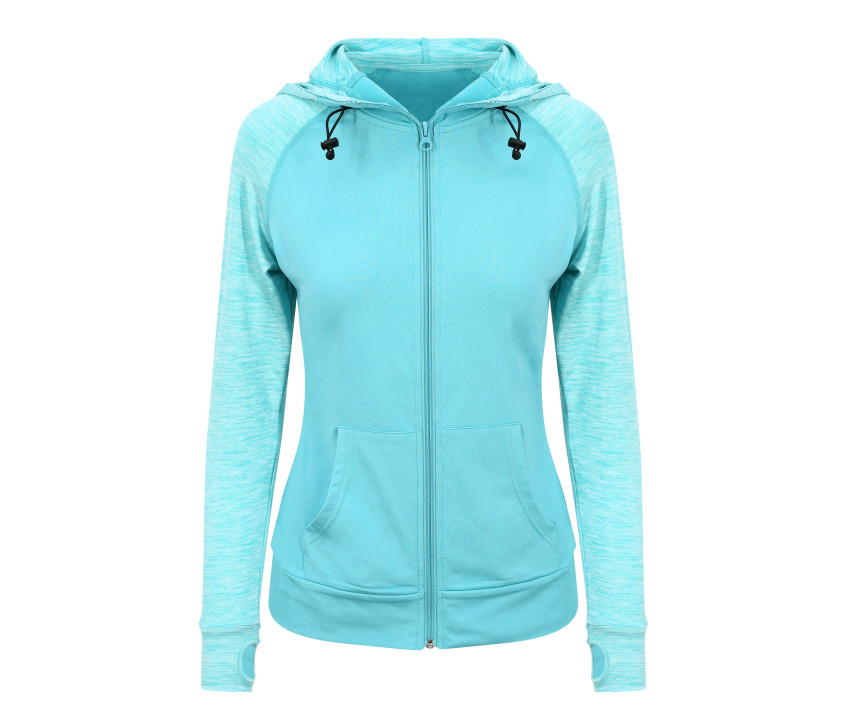 Raglanärmel in Kontrastfarben. Sportliche Passform. Im Rücken abgerundeter Saum. Schnell trocknend. Verstellbare Kapuze. Kängurutasche. Durchgehender Reißverschluss. Daumenlöcher.