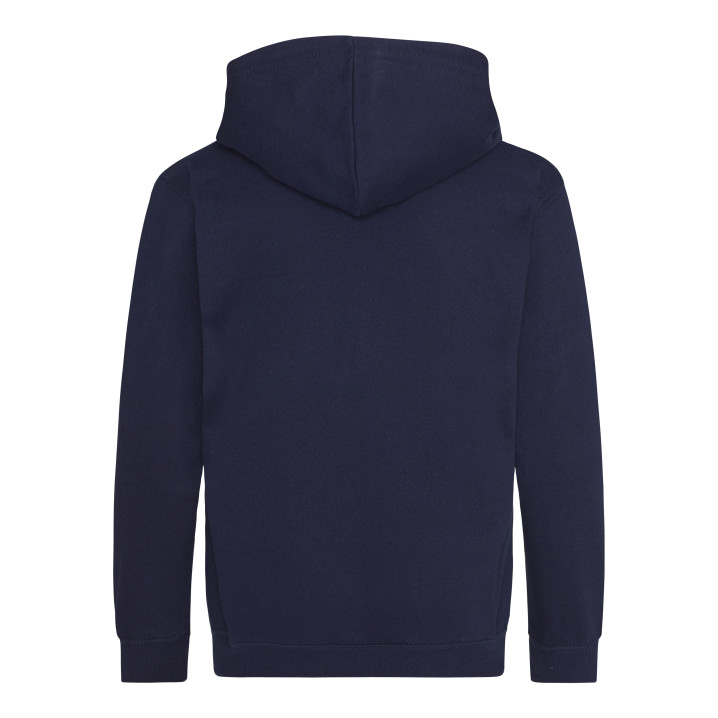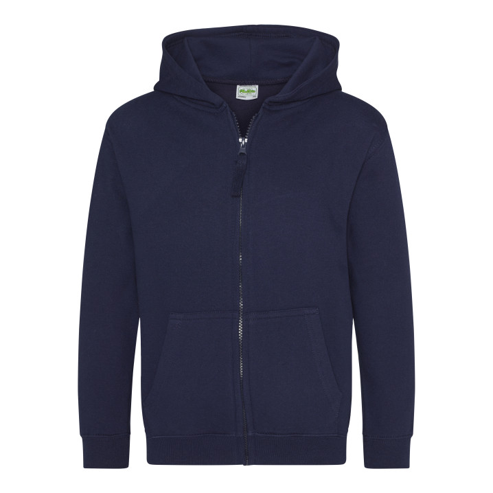 Durchgehender Reißverschluss. Unsichtbarer Reißverschluss. Gefütterte Kapuze. 2 Fronttaschen. Rippenbündchen an Ärmel und Saum. Ablösbares Etikett. Innen gebürstet.