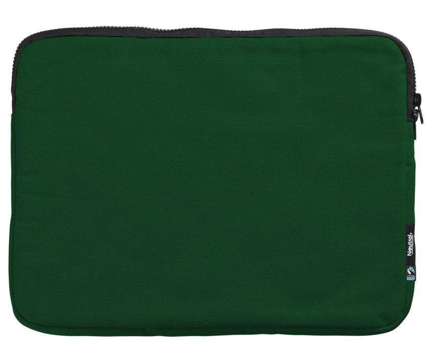 Reißverschluss mit Doppelschieber. Etiketten Neutral und Fairtrade an der Seite. Geeignet für einen 15 Zoll-Laptop.