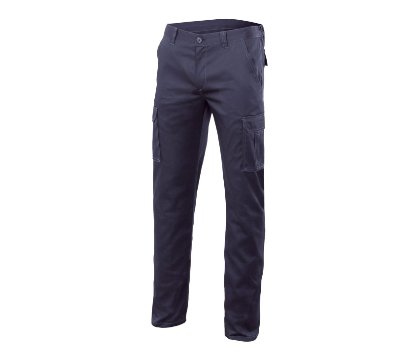 Hosenschlitz mit Knopf und Reißverschluss. Verstärkte Kontrastnähte. Elastischer Bund. 6 Taschen: 2 Seitentaschen, 2 Taschen mit doppelter Klappe, Klettverschluss und Schieber, 2 Gesäßtaschen mit Klappe und Klettverschluss.