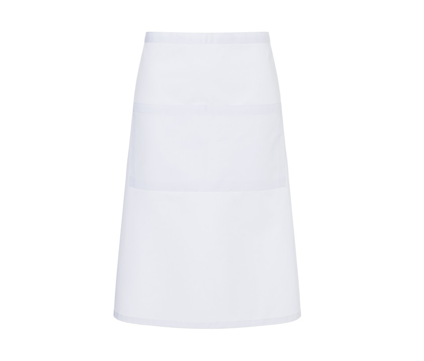 Klassische und funktionelle Bistro-Schürze. Durchgehendes Band aus dem gleichen Stoff wie die Schürze. Verstärkte Naht an den Bändern der Schürze. Aufgesetzte Tasche (40x20 cm) mit 2 Fächern. Größe: 70x70 cm.