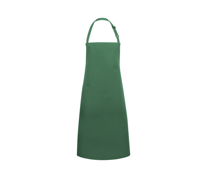 Latzschürze mit Bändern aus dem gleichen Material. Verstärkte Nähte. Länge der Bänder bis 70 cm verstellbar. Bänder mit Schnallen. Aufgesetzte Tasche mit 2 Fächern (40x20 cm). Größe: 75x90 cm.