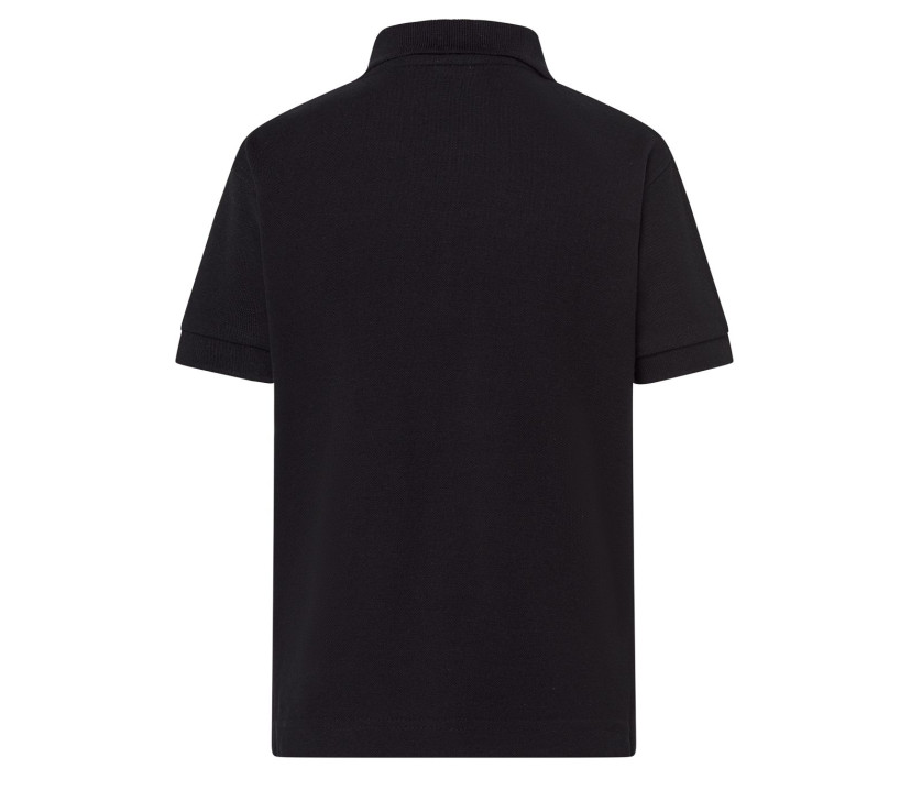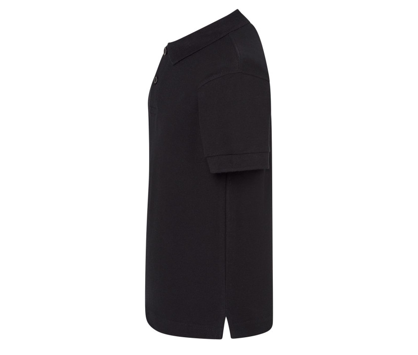 Piqué. Knopfleiste mit 2 Knöpfen. 1x1 Rippenbündchen an Hals und Ärmeln. Seitliche Schlitze. Ablösbares Etikett.