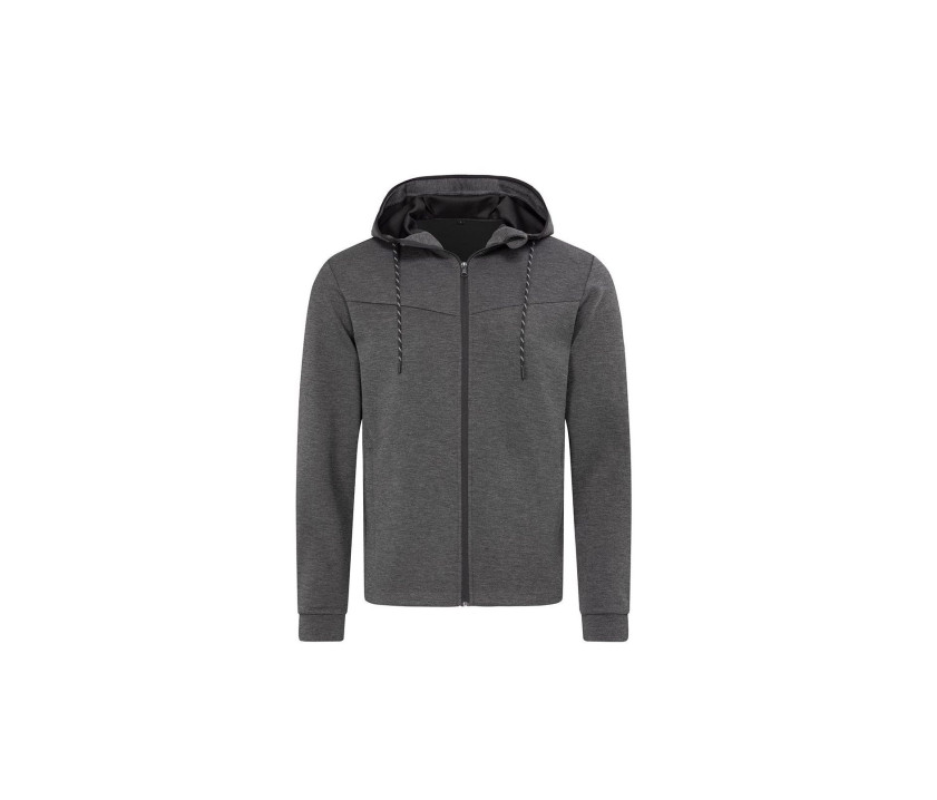 Funktionelles umweltfreundliches Gewebe, hergestellt aus recycelten Plastikflaschen (8 pro Jacke). Kapuze im Taucherstil mit elastischem Band und zweifarbiger Kordel. Metallösen für die Kordel (ohne Nickel). 2 Seitentaschen mit verdecktem Reißverschluss. Reißverschluss mit Schieber aus Metall (ohne Nickel). Dekorative flache Nähte. Nackenband. Seitliche Nähte.
