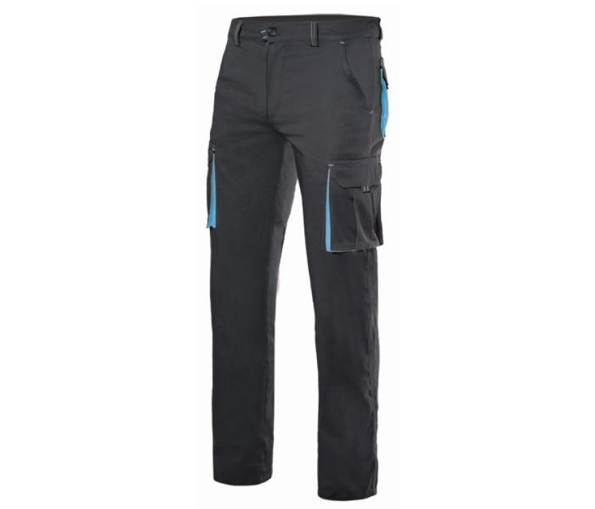 Reißverschluss und Knopf vorne. Klappen, Schieber und Nähte in Kontrastfarben. Elastischer Bund. Doppelte Sicherheitsnaht. Sechs Taschen: 2 Einschubtaschen, 2 Taschen mit doppelter Klappe, Klettverschluss und Schieber in der Mitte, 2 Gesäßtaschen mit Klappe, Klettverschluss und Schieber.