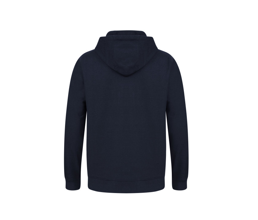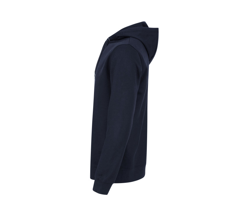 Innen angeraut. Rippenbündchen an Ärmelabschlüssen und Bund. Gerade Ärmel. Kapuze mit Zugband. Ösen und Enden des Zugbands aus recyceltem Metall. Gerippter V-Einsatz am Halsausschnitt.