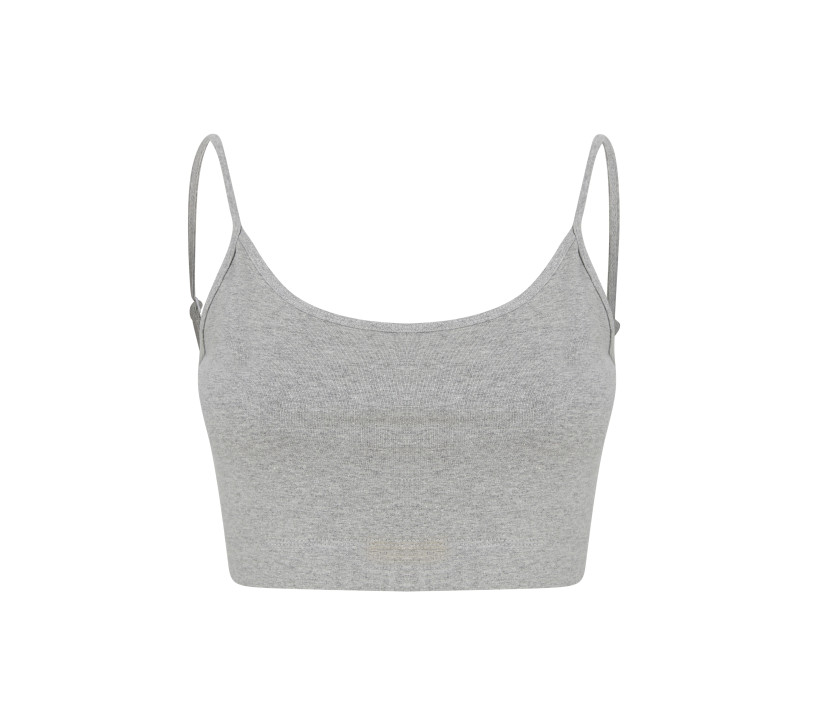 Verstellbare Spaghettiträger. Runder Hals- und Armausschnitt. Vorne mit unsichtbarem Büstenhalter gefüttert. Elastisches Band am Saum des T-Shirts. Ablösbares Etikett.
