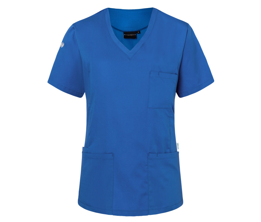 - Kragen mit V-Ausschnitt. Eignet sich besonders für die Bereiche Gesundheit und Schönheit. Leicht taillierte Passform.