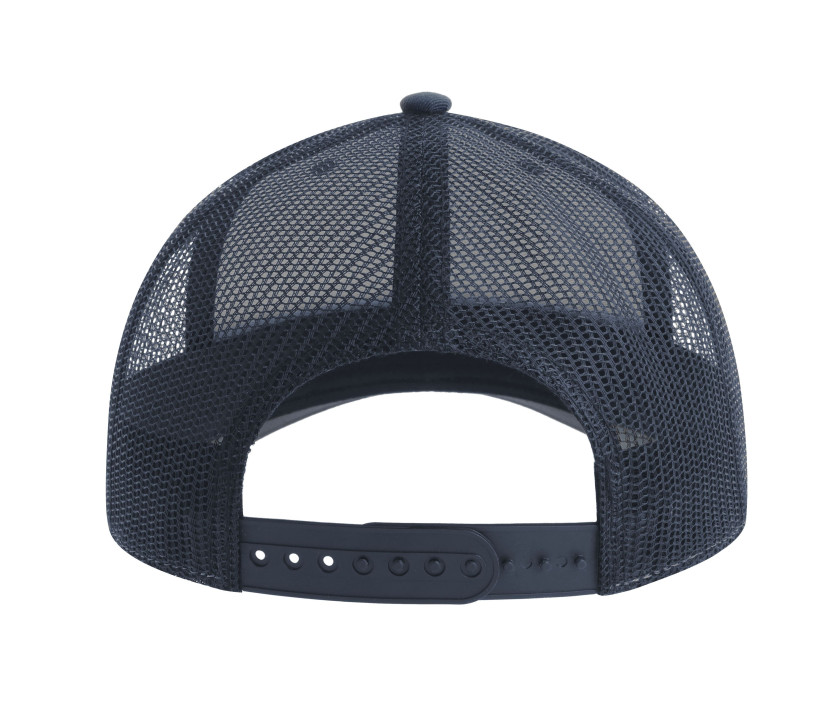 Recyceltes Polyester-Netz. Verschluss mit Band. Leicht und atmungsaktiv. Kopfumfang: 58cm. Schirm mit Kunststoffkernstruktur gefertigt.