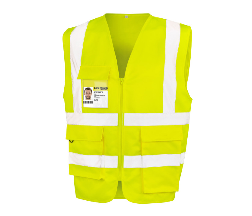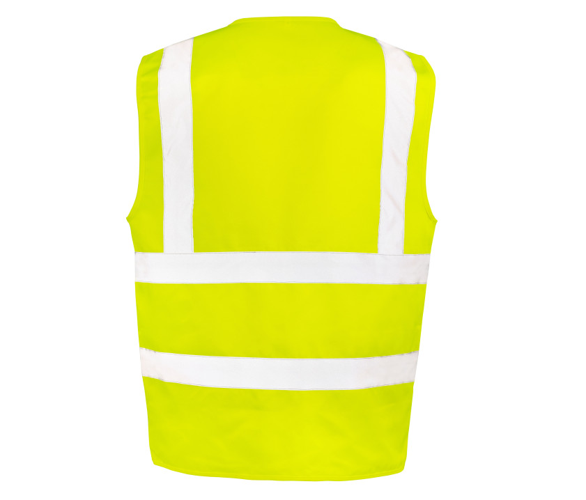 5 cm breite reflektierende Streifen auf Körper und Schultern. Großer Logobereich auf Brust und Schultern. Tiefe Tasche für Kontrollgeräte. Verschieden tiefe Seitentaschen mit Klettverschluss. Brusttasche mit transparentem Etui (9x11,5cm) für einen Ausweis. Reißverschluss vorne. Lockere Passform. D-Ring-Verschluss. Aufhängelasche. Zertifiziert nach EN ISO 2013+A1 :2016 Klasse 2.