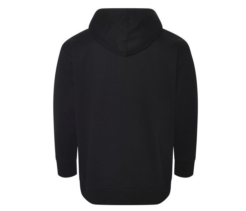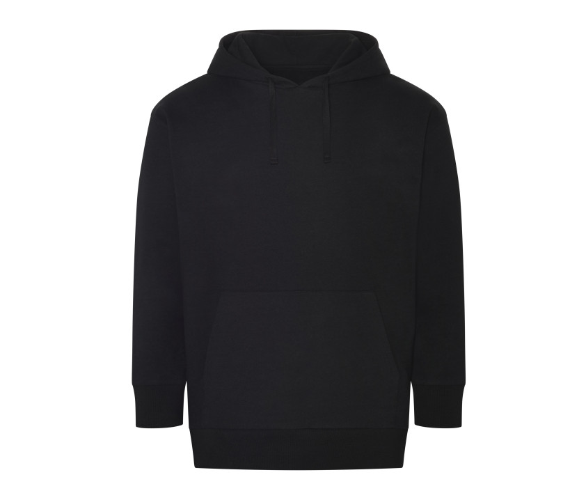 Unisex Schnitt. Kängurutasche. 2x1 Rippstrickbündchen an Ärmeln und Taille. Aufgeraute Innenseite. Größenchip am Kragen. DTM-Kordeln Ton in Ton.
