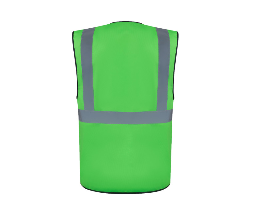 Zertifiziert nach EN ISO 20471:2013/A1:2016; Orange zertifiziert nach RIS-3279-TOM Iss 2; Neon Green & Neon Pink zertifiziert nach EN 17353:2020 Typ AB3; andere Farben nach EN 17353:2020 Typ B3. Horizontaler 5 cm breiter reflektierender Streifen. 2 reflektierende 5 cm breite Streifen an den Schultern. Reißverschluss. 2 Taschen mit Patten und Klettverschluss. Multifunktional: Ausweisfach, große Handytasche, Stiftehalter. Garantierte reflektierende Eigenschaften gemäß EN-Norm für 25 Wäschen bei 40°C.