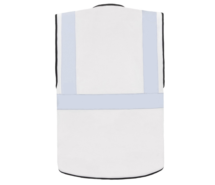 Zertifiziert nach EN ISO 20471:2013/A1:2016; Orange zertifiziert nach RIS-3279-TOM Iss 2; Neon Green & Neon Pink zertifiziert nach EN 17353:2020 Typ AB3; andere Farben nach EN 17353:2020 Typ B3. Horizontaler 5 cm breiter reflektierender Streifen. 2 reflektierende 5 cm breite Streifen an den Schultern. Reißverschluss. 2 Taschen mit Patten und Klettverschluss. Multifunktional: Ausweisfach, große Handytasche, Stiftehalter. Garantierte reflektierende Eigenschaften gemäß EN-Norm für 25 Wäschen bei 40°C.