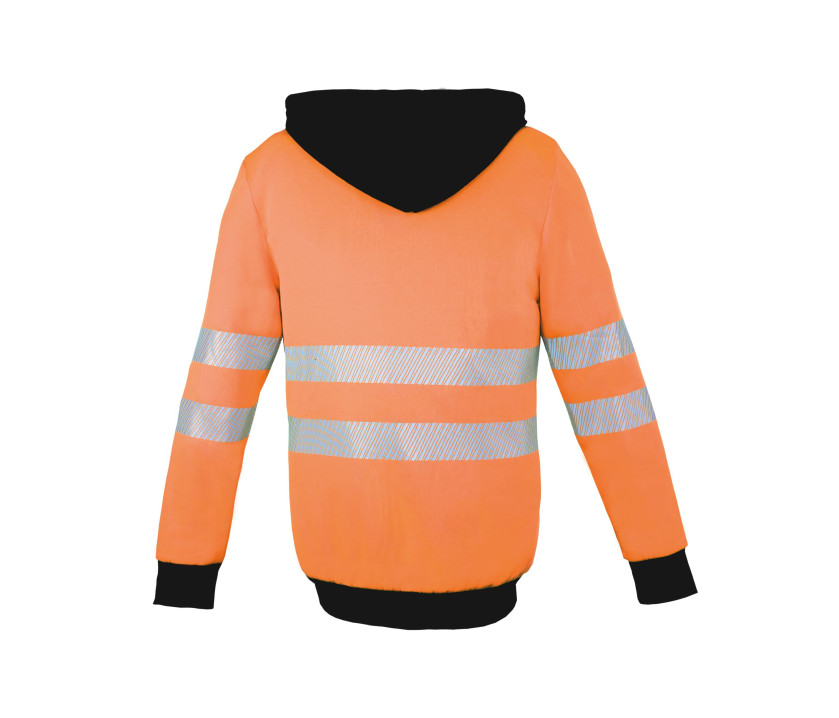 Zertifiziert nach EN ISO 20471:2013/A1:2016, Klasse 3. 2 reflektierende, 5 cm breite Streifen am Körper und an den Ärmeln. Schwarzer Kragen und Ärmelbündchen aus Rippstrick. Große Druckfläche auf der Brust. Innenseite der Kapuze gefüttert und kontrastierend. Kängurutasche. Reflektierende Eigenschaften gemäß EN-Norm garantiert für 25 Waschzyklen bei 60°C.