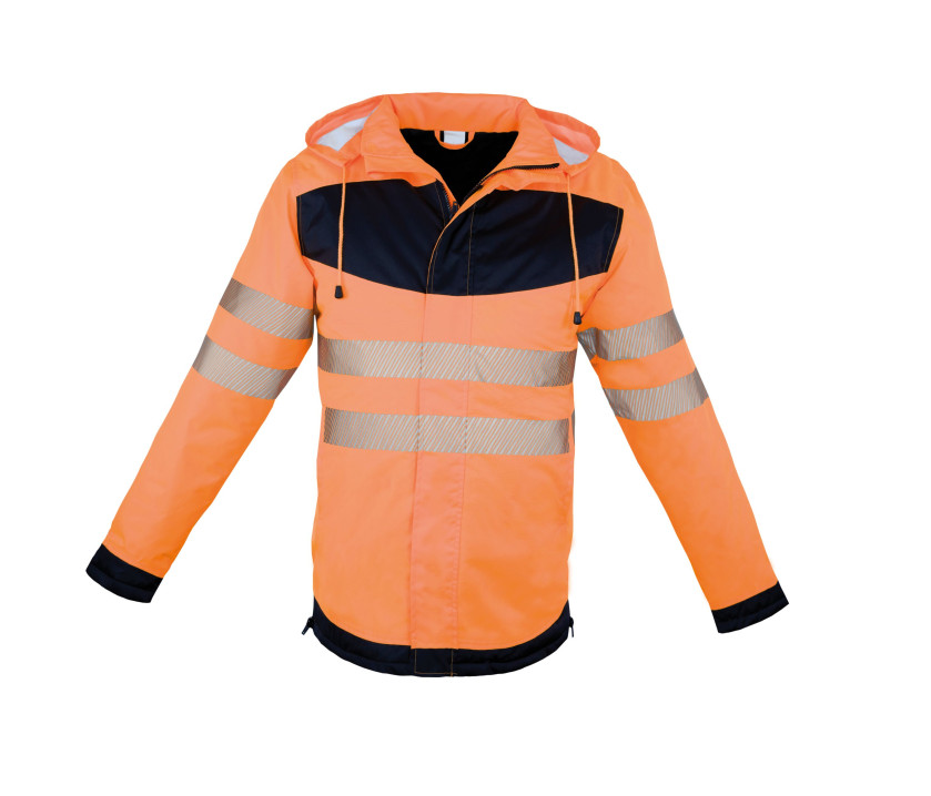 Zertifiziert nach EN ISO 20471:2013/A1:2016, Klasse 3. Farbe Orange ebenfalls zertifiziert nach RIS-3279-TOM Iss 2. Zertifiziert nach EN 343:2019 3:1 wasserdicht bis 8.000 mm. 2 reflektierende, 5 cm breite Streifen am Körper und an den Ärmeln. Zugang zur Personalisierung. 2 Seitentaschen. Verdeckte Brusttasche mit Reißverschluss. Tasche auf der Innenseite. Winddicht und wasserabweisend. Reflektierende Eigenschaften gemäß EN-Norm garantiert für 25 Waschzyklen bei 40°C.