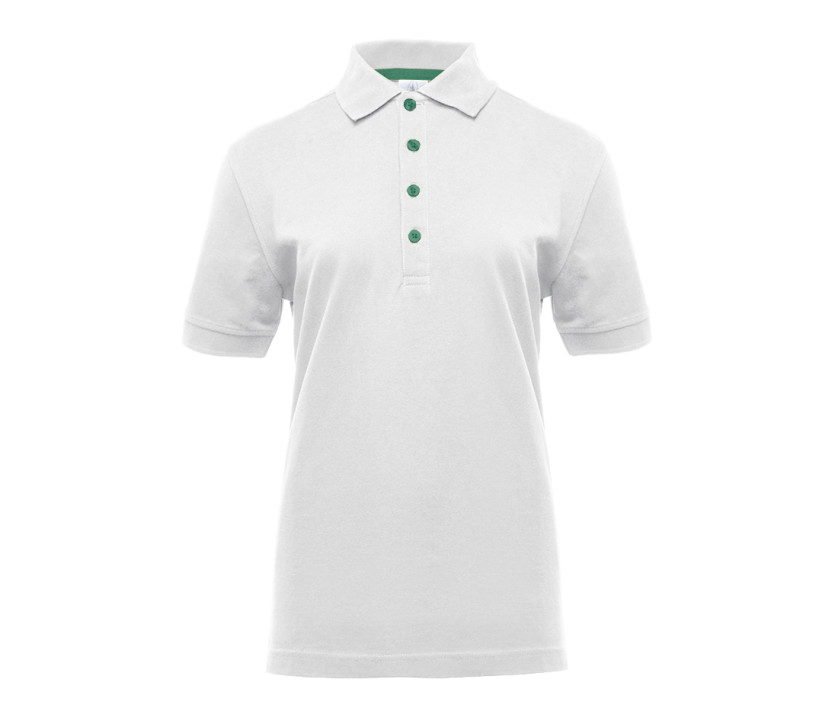 Damen-Poloshirt mit Kontrastknöpfen - Nackenband in Kontrastfarbe. Gerippte Manschetten und Kragen. 4 Knöpfe.