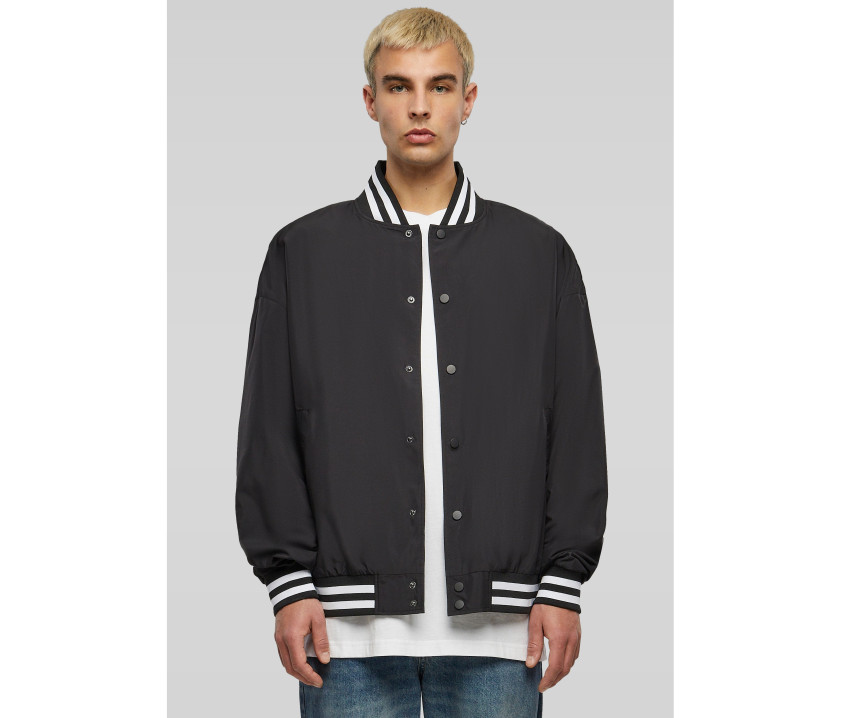 Verschluss mit Druckknöpfen. Gerippte Bündchen, Kragen und Bund. Neutrales Größenetikett ohne Branding.