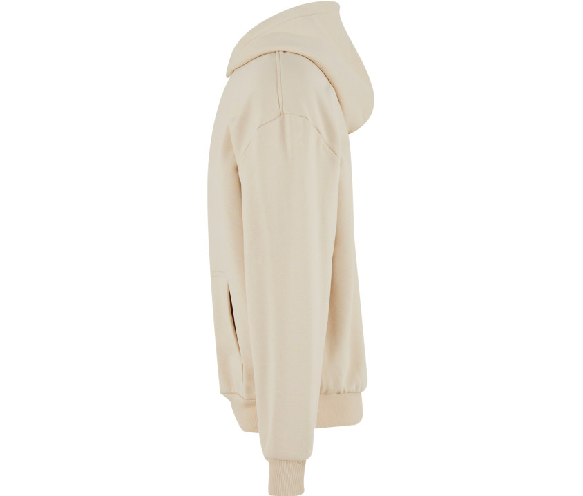 Kängurutasche. Kein Kordelzug an der Kapuze. Aufgeraute Innenseite. Ohne Markenetikett, nur ein Größenchip.