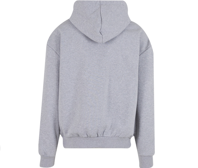 Kängurutasche. Kein Kordelzug an der Kapuze. Aufgeraute Innenseite. Ohne Markenetikett, nur ein Größenchip.