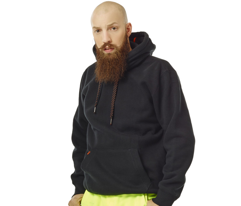 - Känguru-Beutel. Bündchen und Taille mit Bündchen. Kapuze mit großem Kordelzug. Innen angeraut.