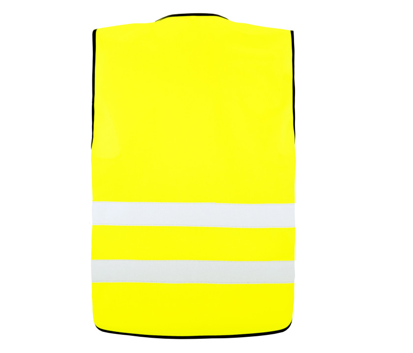 Sicherheitsweste mit zwei 5 cm breiten reflektierenden Streifen um den Körper. Verschlüsse mit Klettverschluss. Farbe hi vis yellow und hi vis orange genormt nach EN ISO 20471:2013/A1:2016.