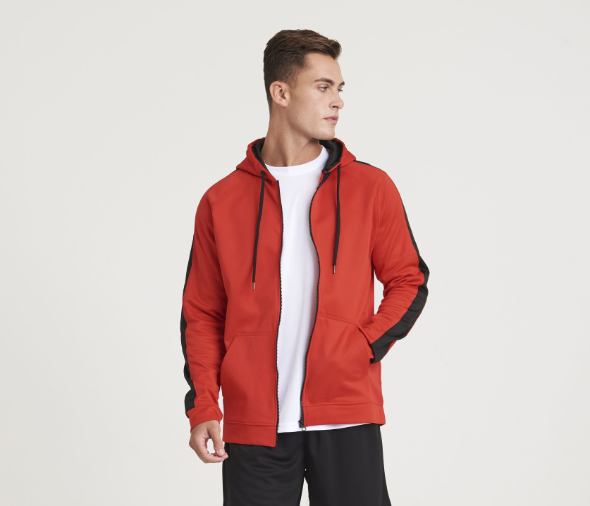 Standard-Passform. Kapuze mit durchgehendem Reißverschluss. Kontrastfarbiger Kunststoff-Reißverschluss. Raglanärmel mit kontrastierender Blende. Kontrastfarbene runde Kordelzüge. Dreiteilige Kapuze mit kontrastierender Innenseite. Innenseite aus gebürstetem Fleece. Geteilte Känguru-Taschen. Details mit Zwillingsnadeln genäht. Abreißbares Etikett.