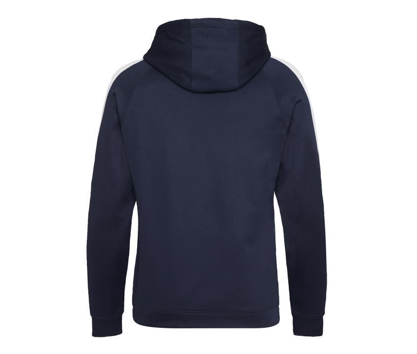Standard-Passform. Kapuze mit durchgehendem Reißverschluss. Kontrastfarbiger Kunststoff-Reißverschluss. Raglanärmel mit kontrastierender Blende. Kontrastfarbene runde Kordelzüge. Dreiteilige Kapuze mit kontrastierender Innenseite. Innenseite aus gebürstetem Fleece. Geteilte Känguru-Taschen. Details mit Zwillingsnadeln genäht. Abreißbares Etikett.