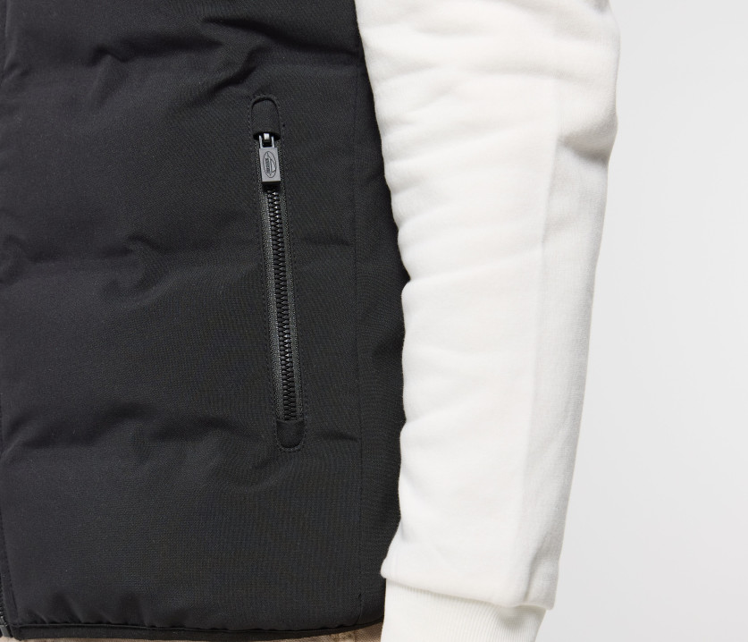 - Recycelte Steppung. Thermoverschweißte Bänder. Schutz am Hals. Elastische Bündchen an Saum und Armlöcher.