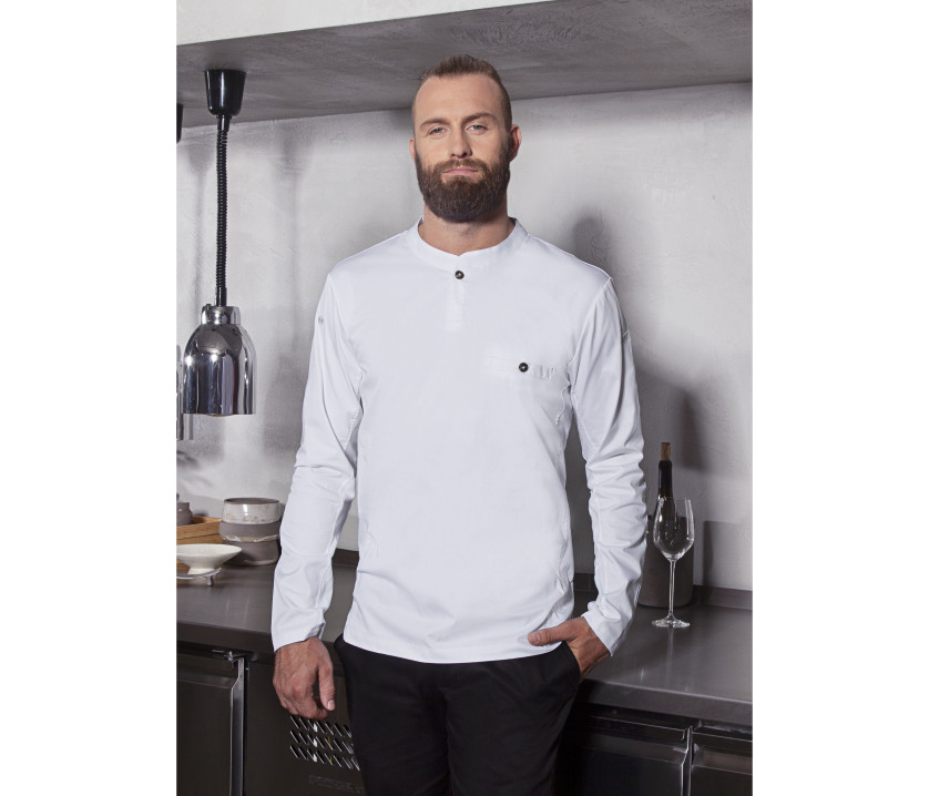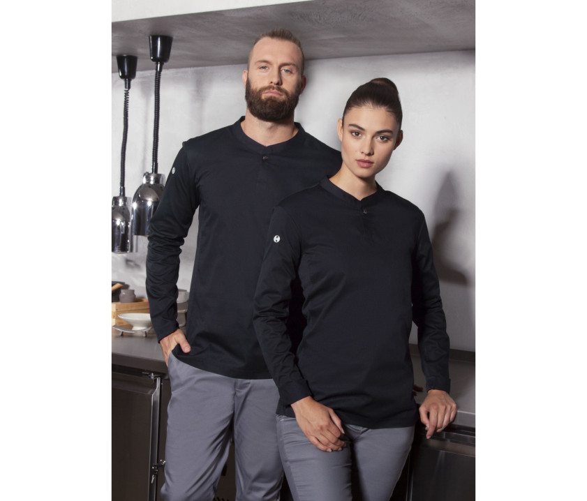 Langärmliges Arbeits-T-Shirt mit sportlich-elegantem Look. Schlanke Passform. Geeignet für folgende Bereiche: Kochen, Service, Reinigung, Pflege, Wohlbefinden... Rückseite aus Piqué-Jersey. Hohe Waschbeständigkeit gegen hartnäckige Flecken. Schmaler Stehkragen und kleine Knopfleiste. Leistentasche auf der Brust mit Knopf. Leistentasche am linken Ärmel.