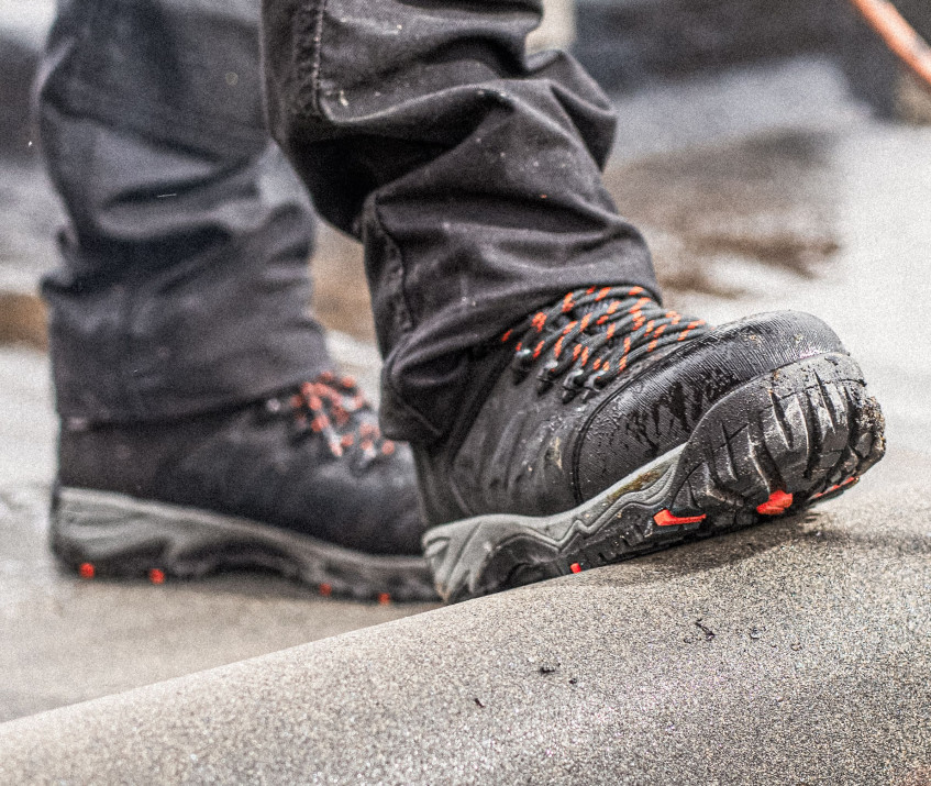 Zehenschutzkappe aus Verbundstoff. Metallfreie, durchtrittsichere, ergonomisch geformte und bequeme EVA/Gummisohle. EN ISO 20345:2022.