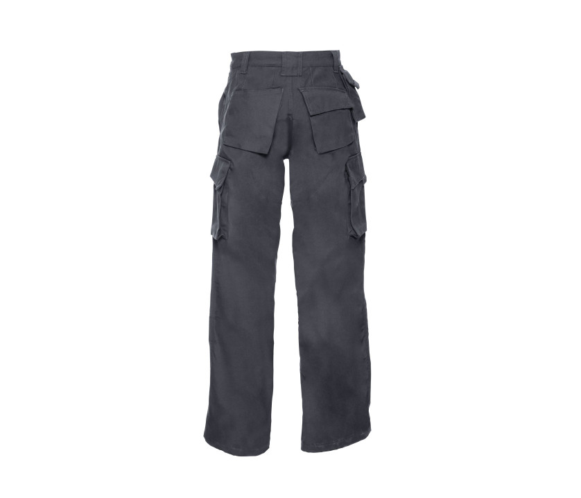 Maschinen Waschbar bis 60 °C und Trocknen im Wäschetrockner. Wasserabweisend und winddicht. Schutzbeschichtung gegen Flecken mit DuPont™ Teflon®. Kniepolstertaschen innen, maximal 21x15 cm. Große aufgesetzte Taschen auf jeder Seite mit mehreren Fächern. Handytasche unter dem Gürtel. 2 Gesäßtaschen: 1 offen und 1 mit Klappe und Klettverschluss. Verstärkter Boden, ideal für handwerkliche Arbeit.