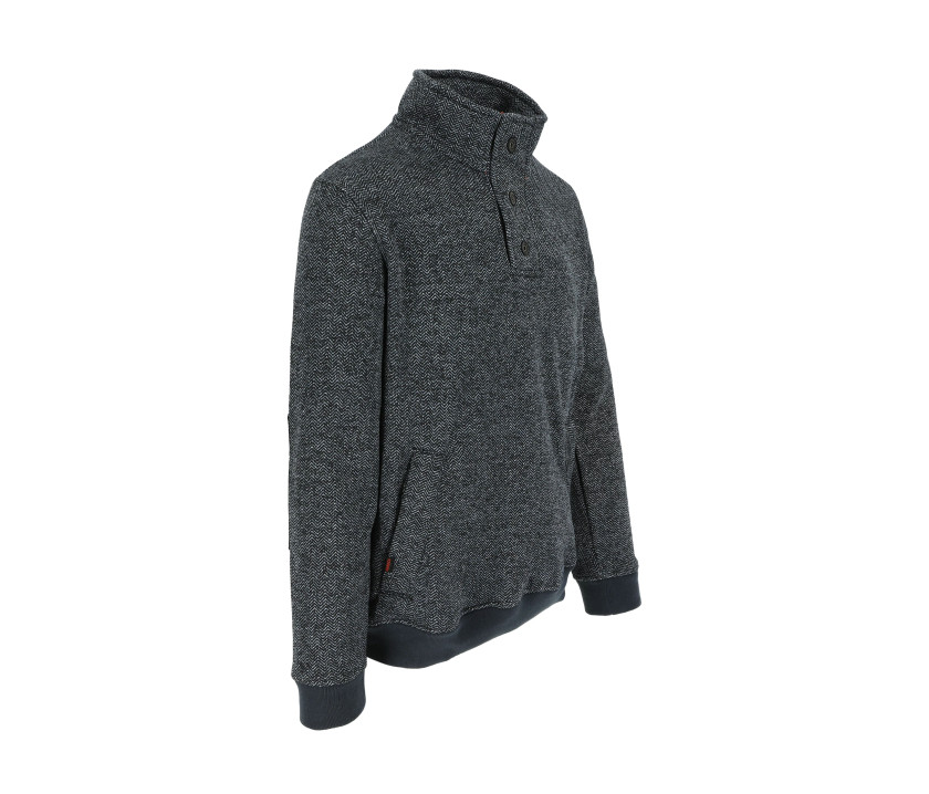 Kragen mit Druckknöpfen. 2 Seitentaschen. Ärmelbündchen und unten aus Rippstrick.
