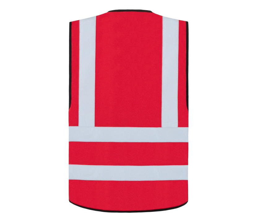 Entspricht der Spezifikation EN ISO20471. 2 Querstreifen und 2 Längsstreifen, retroreflektierend. Bund mit Klettverschluss verstellbar.