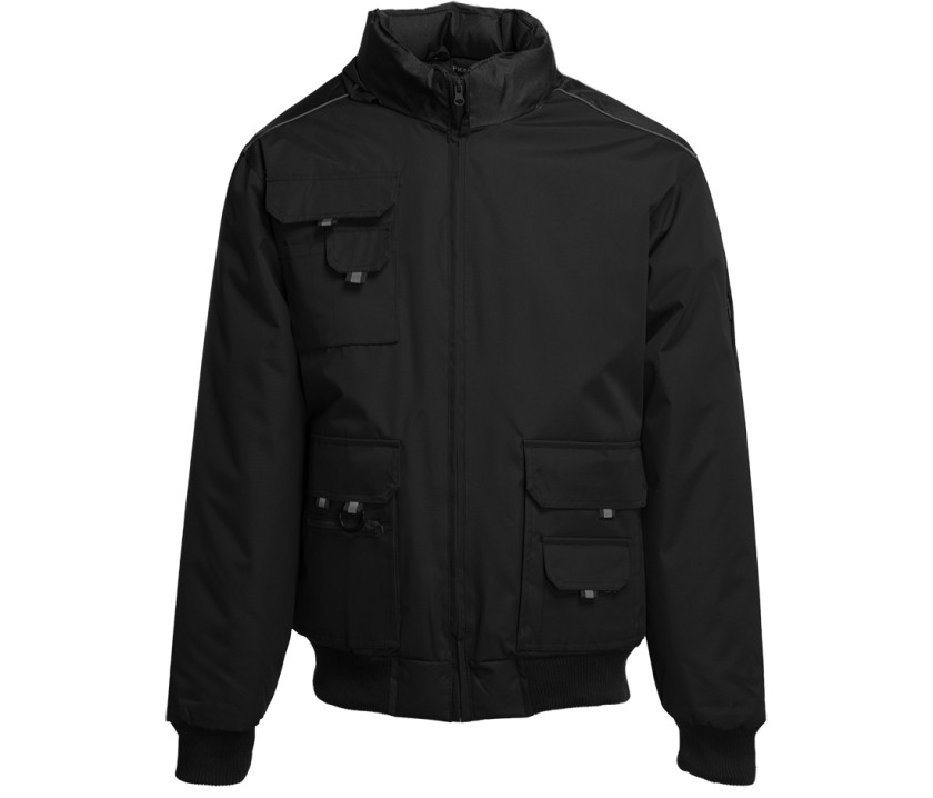 Wasserdicht und winddicht. 12 Außentaschen: 1 Vordertasche mit Reißverschluss, 5 Taschen mit Klettverschluss, 2 Seitentaschen, 3 Stifttaschen und Reißverschlusstasche am Ärmel. Reflexstreifen an den Taschen und den Schultern. Kapuze im Kragen, verstellbar mit Stopper. Durchgehender Reißverschluss. Rippenbündchen an Ärmel und Saum. Innentasche Klettverschluss. Zugriff für die Beschriftung. Verfügbar als Bodywarmer Ref. PK355 Seite 191.
