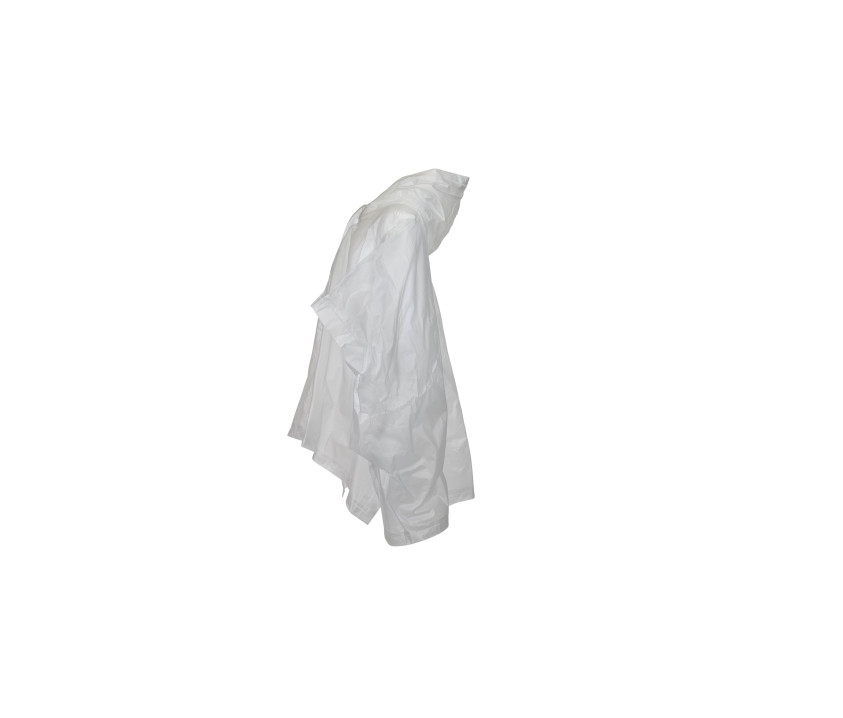 Regencape aus PVC. Wasserdicht und winddicht. Kragenverschluss durch 2 Druckknöpfe. Kapuze mit Zugband. Kann flach ausgebreitet werden, um als Abdeckplane oder Schutz am Boden zu dienen. Mit einem Täschchen mit Griff verkauft. 2 Druckknöpfe auf jeder Seite.