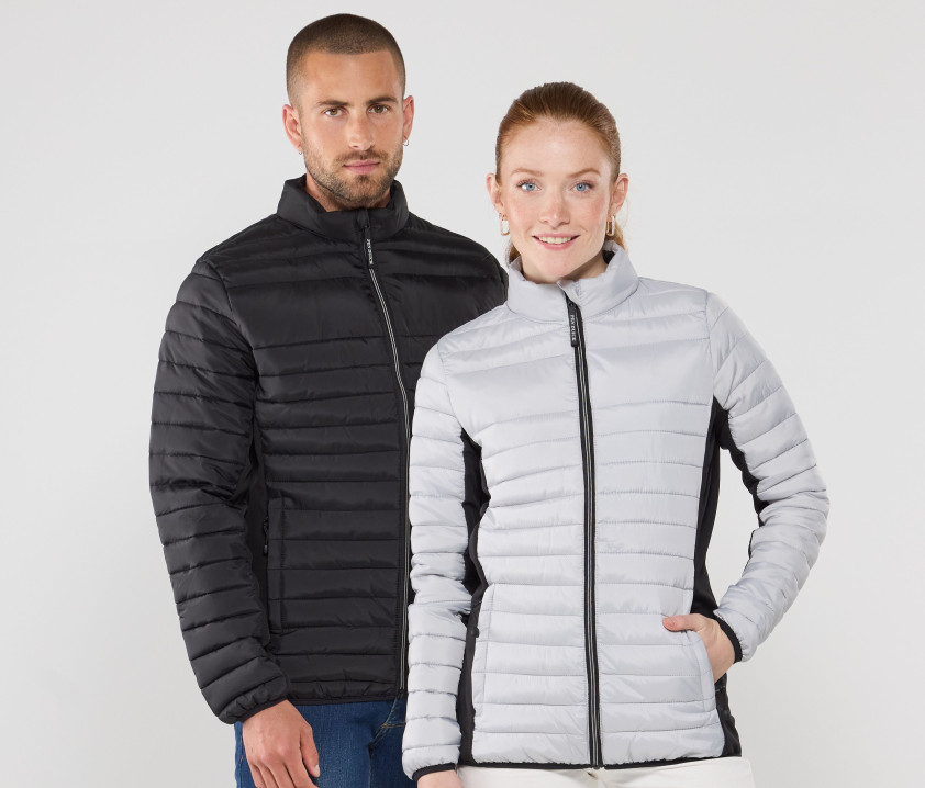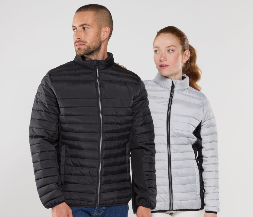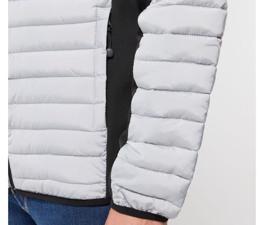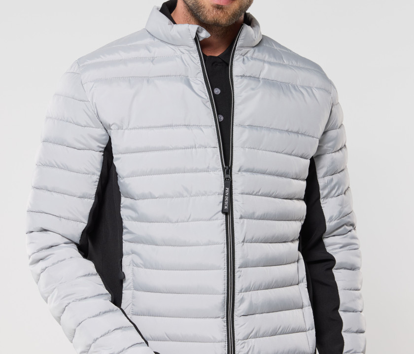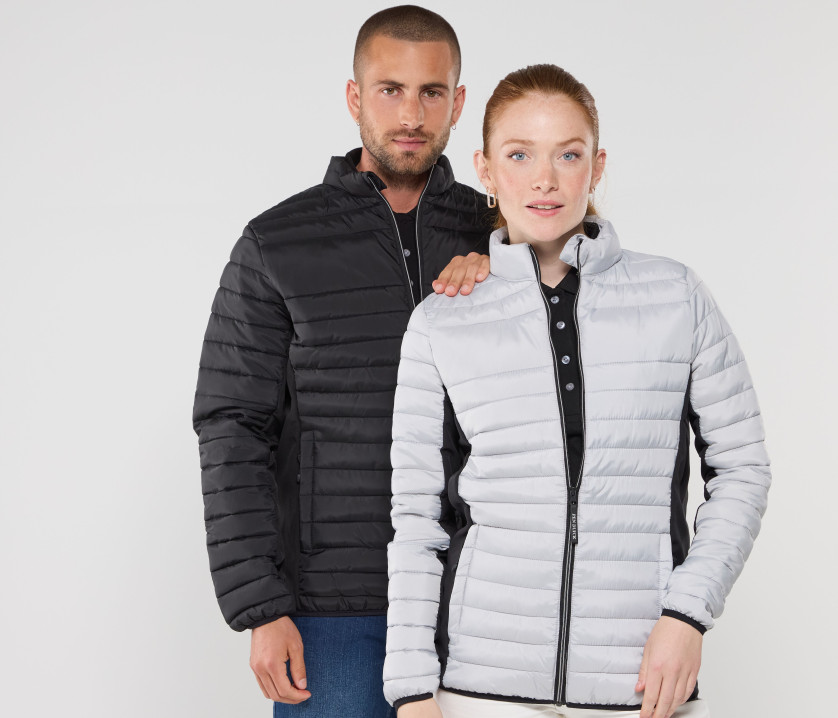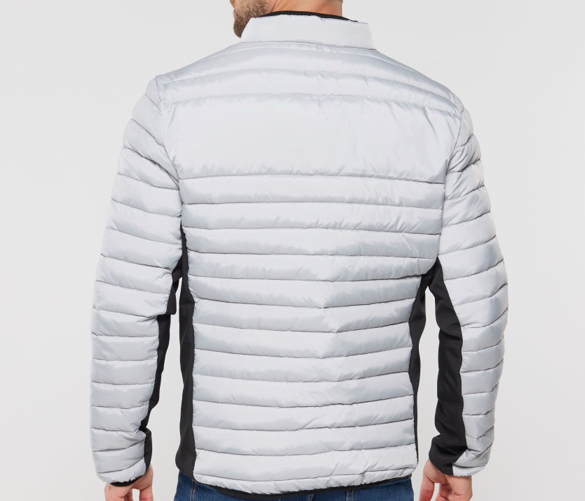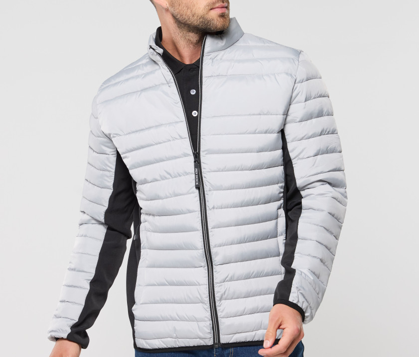Leichte, modische Daunenjacke aus Bi-Material, anliegende Passform. 2 Seitentaschen mit Reißverschluss. 2 Innentaschen. Kinnschutz. Kontrastierte Reißverschlüsse. Druckfläche vorne 9 cm und hinten 12 cm.