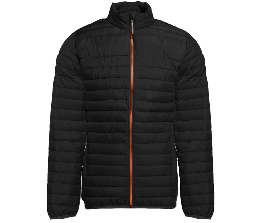Leichte, modische Daunenjacke aus Bi-Material, anliegende Passform. 2 Seitentaschen mit Reißverschluss. 2 Innentaschen. Kinnschutz. Kontrastierte Reißverschlüsse. Druckfläche vorne 9 cm und hinten 12 cm.