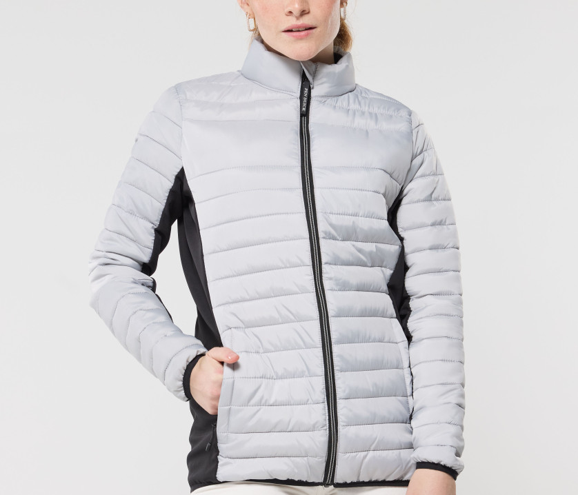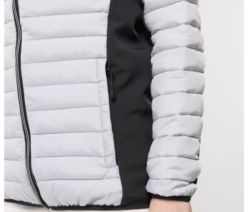 Leichte, modische Daunenjacke aus Bi-Material, anliegende Passform. 2 Seitentaschen mit Reißverschluss. 2 Innentaschen. Kinnschutz. Kontrastierte Reißverschlüsse. Druckfläche vorne 9 cm und hinten 12 cm.