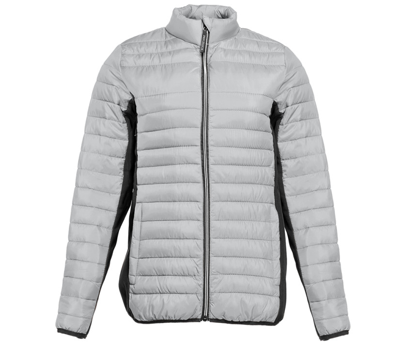 Leichte, modische Daunenjacke aus Bi-Material, anliegende Passform. 2 Seitentaschen mit Reißverschluss. 2 Innentaschen. Kinnschutz. Kontrastierte Reißverschlüsse. Druckfläche vorne 9 cm und hinten 12 cm.