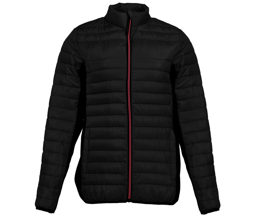 Leichte, modische Daunenjacke aus Bi-Material, anliegende Passform. 2 Seitentaschen mit Reißverschluss. 2 Innentaschen. Kinnschutz. Kontrastierte Reißverschlüsse. Druckfläche vorne 9 cm und hinten 12 cm.