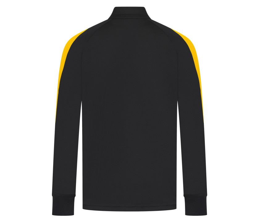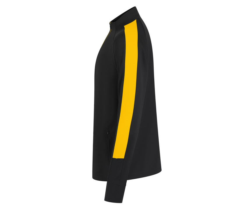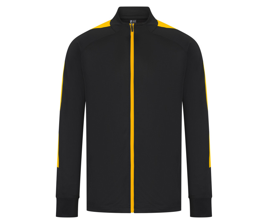 Jacke mit durchgehendem Reißverschluss kontrastiert. Kontraststreifen Schultern und Ärmel. Seitentaschen mit Reißverschluss. Ärmel mit 1x1-Rippenbündchen. Stehkragen.