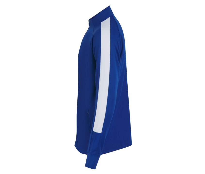 Jacke mit durchgehendem Reißverschluss kontrastiert. Kontraststreifen Schultern und Ärmel. Seitentaschen mit Reißverschluss. Ärmel mit 1x1-Rippenbündchen. Stehkragen.