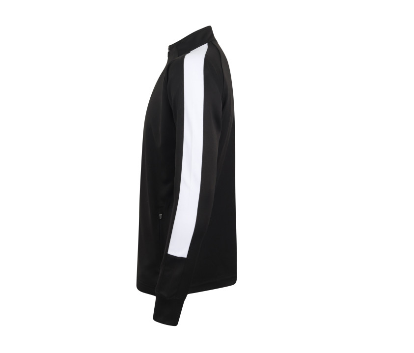 Jacke mit durchgehendem Reißverschluss kontrastiert. Kontraststreifen Schultern und Ärmel. Seitentaschen mit Reißverschluss. Ärmel mit 1x1-Rippenbündchen. Stehkragen.