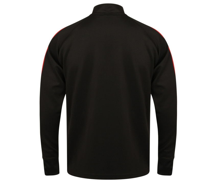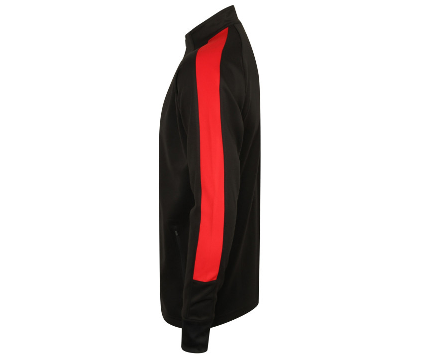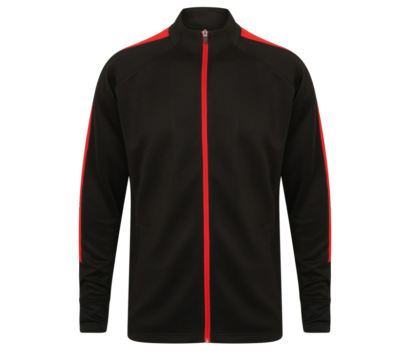 Jacke mit durchgehendem Reißverschluss kontrastiert. Kontraststreifen Schultern und Ärmel. Seitentaschen mit Reißverschluss. Ärmel mit 1x1-Rippenbündchen. Stehkragen.